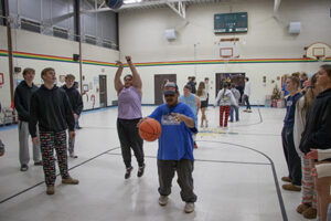 School boys and girls basketball teams to the Center. The residents who enjoy playing, joined team members in the gym to do some warm-up drills before playing a game.